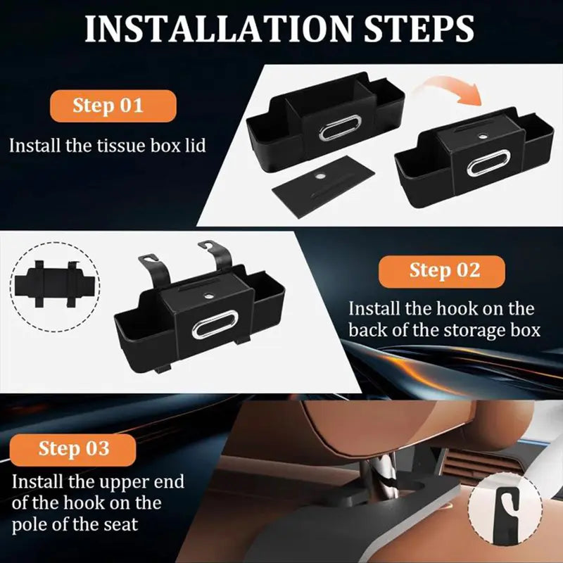 - 1x Backseat Organizer (Cup Holders + Tissue Box Slot + Hooks)