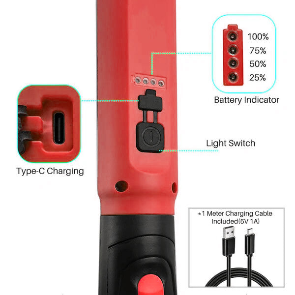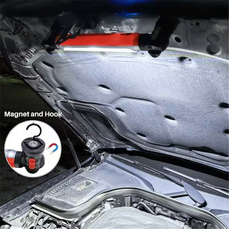 Two strong magnetic bases and hidden 360° swivel hooks let you mount or hang it anywhere — under the hood, on a wall, or above your workspace.