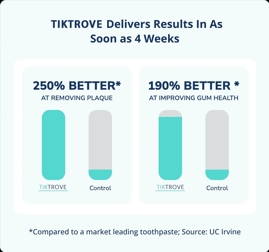 Tiktrove uses Activated Edathamil on a molecular level to strengthen teeth, restore enamel, reduce plaque 250% better and improve gum health 190% better in 4 weeks.