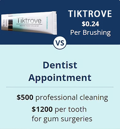 You’ll pay around $500 for professional cleaning and $1200 per tooth for gum surgeries caused by plaque. And they are painful, time-intensive, and expensive. Tiktrove only costs less than $0.24 per brushing, as compared to spending $5 daily on a cup of coffee. So you can easily prevent gum issues and improve oral health... without draining your wallet!