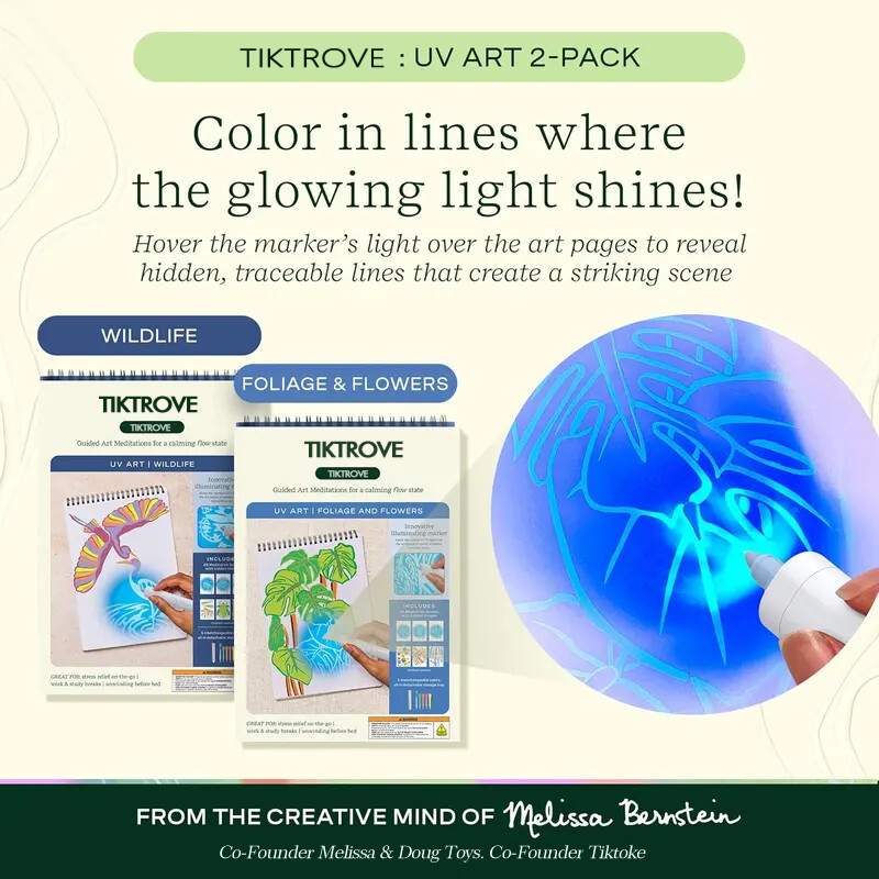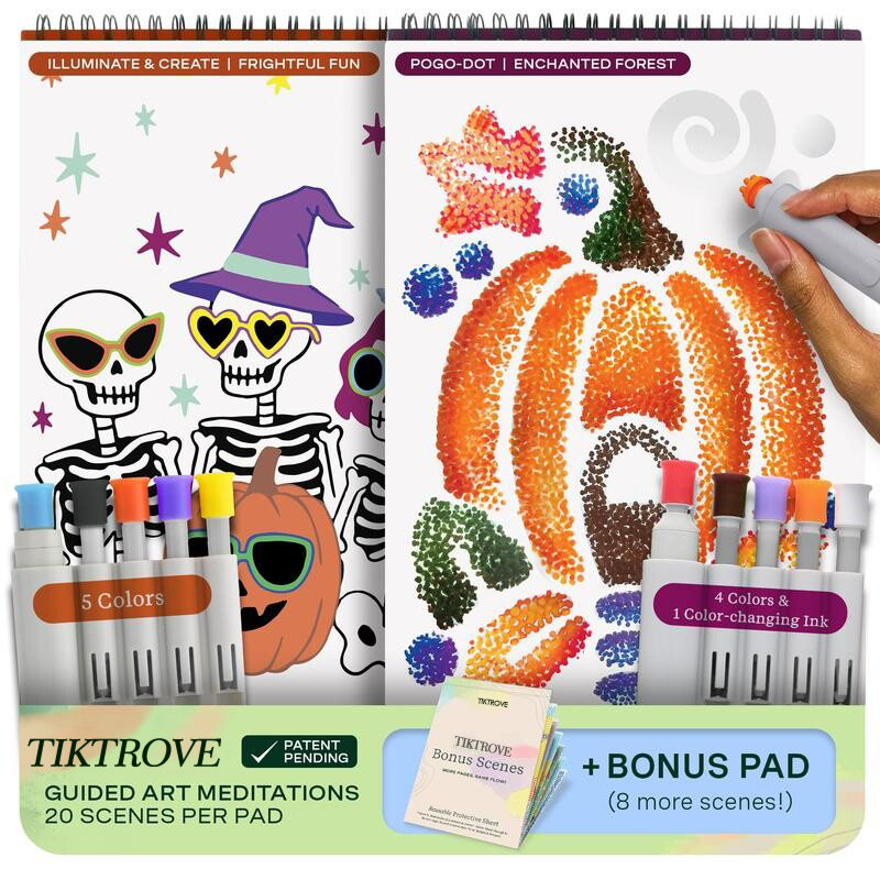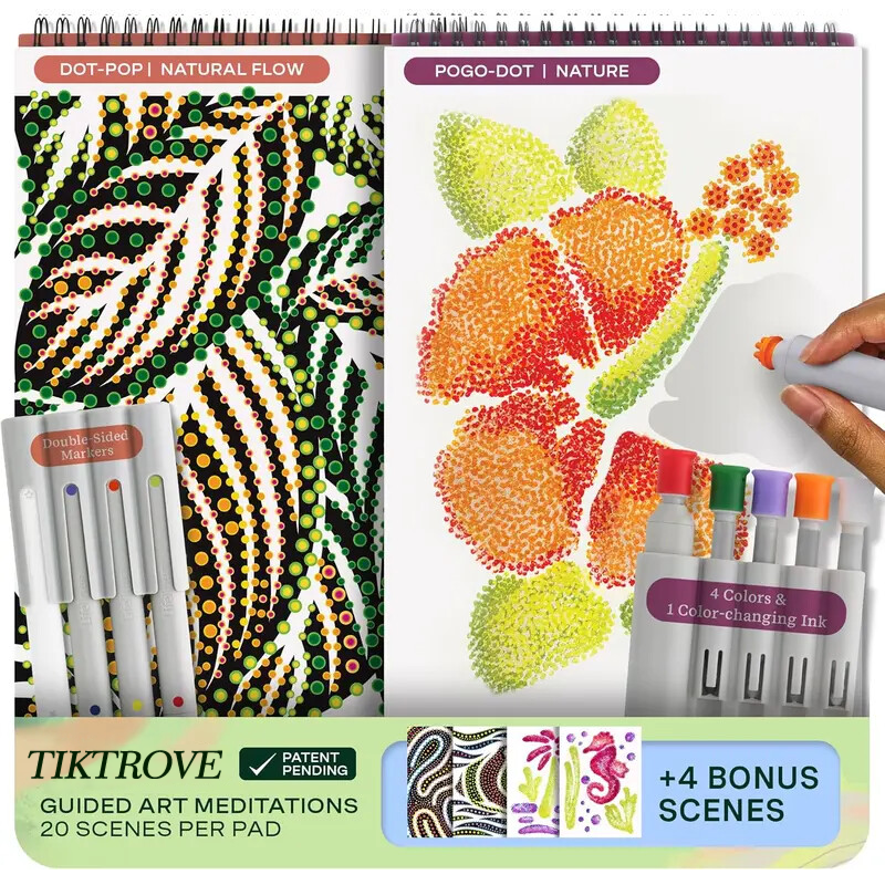 UV Art – Hover the UV marker over the page to reveal hidden, traceable images. Inks are mixable, so you can layer colors and create something entirely new. ·Dot-Pop – Fill blank spaces with colorful dots, then transform them using a white marker with color-changing ink. Perfect For: ·Calming your mind anytime. Designed for work or study pauses, winding down before bed, or wellness on-the-go. Detachable marker trays are travel-friendly and keep markers secure.
