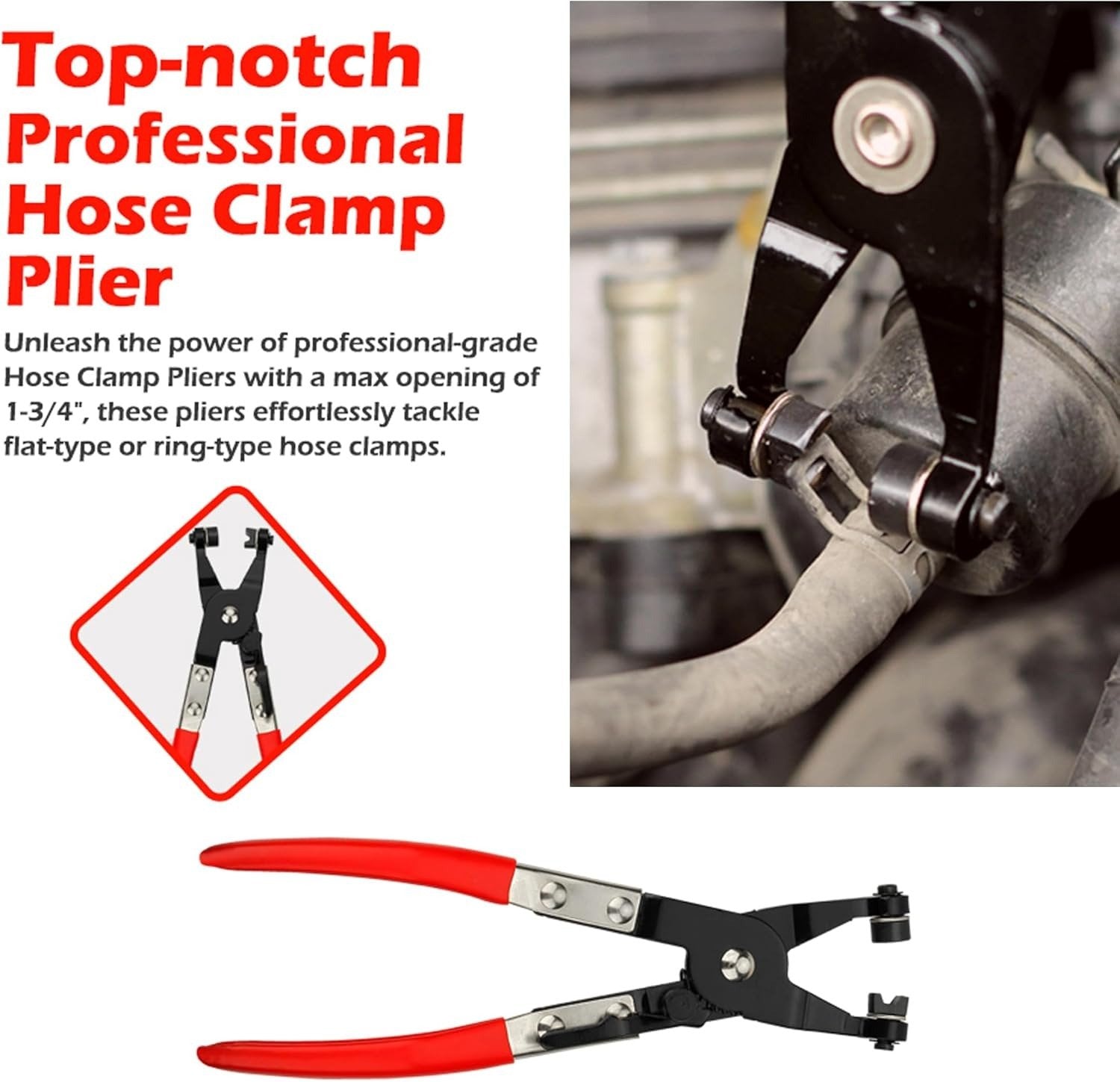 - Professional Hose Clamp Pliers: Handle flat-band and ring-type clamps with a max opening of 1.96".
